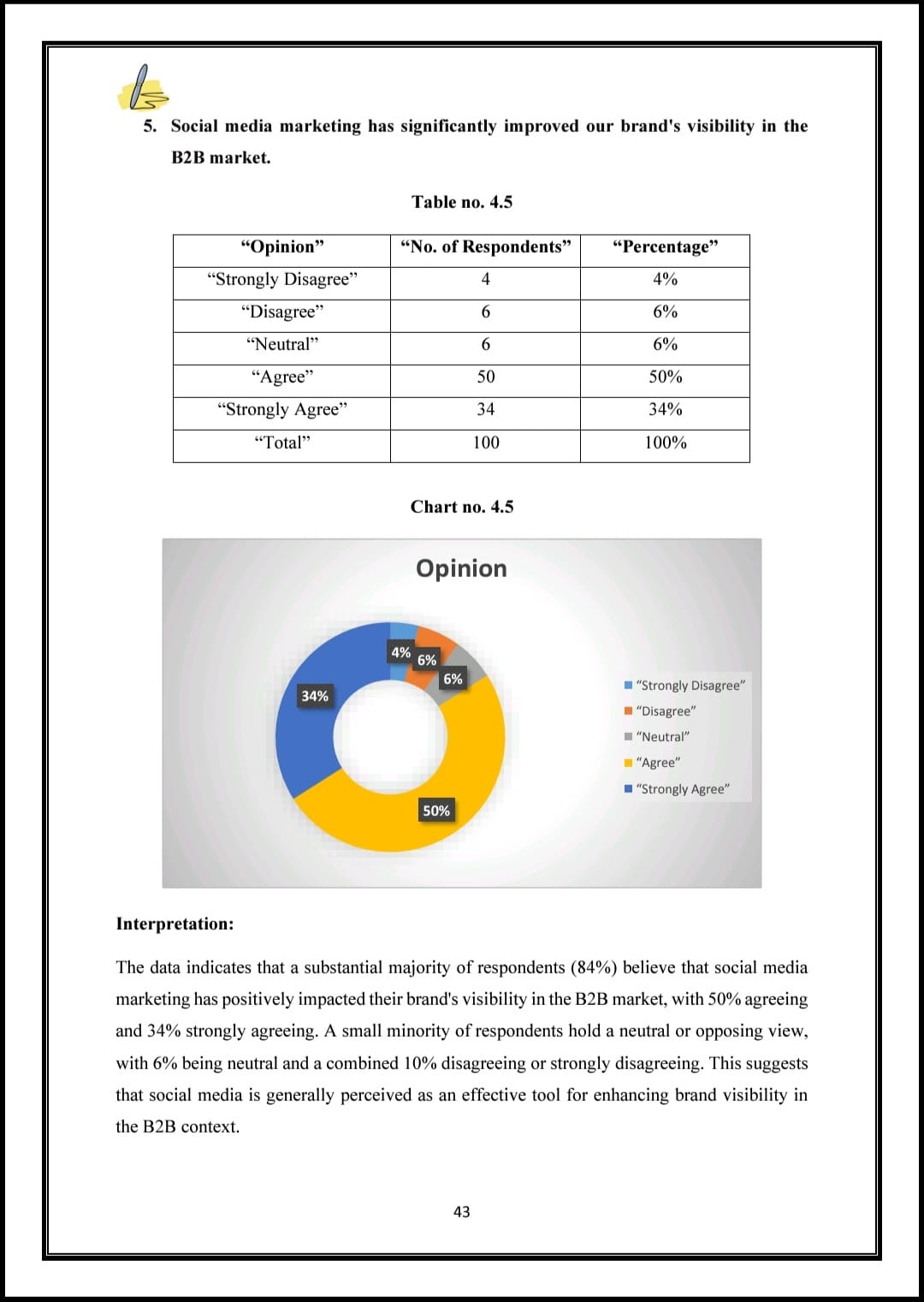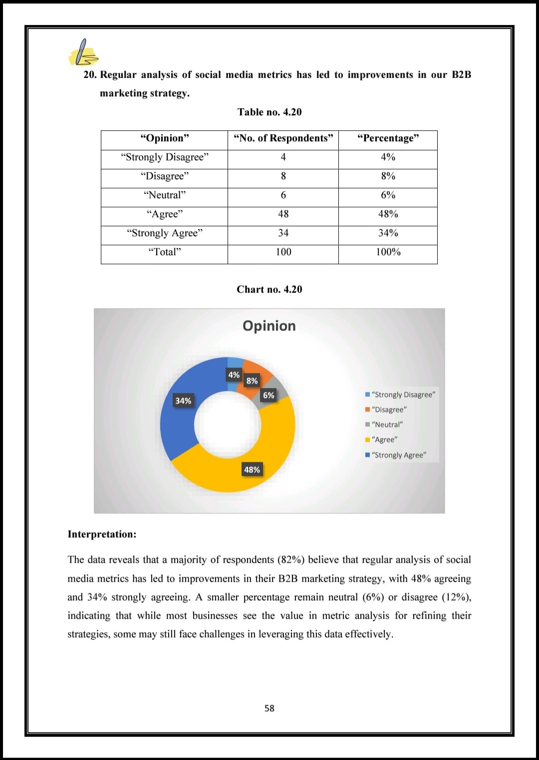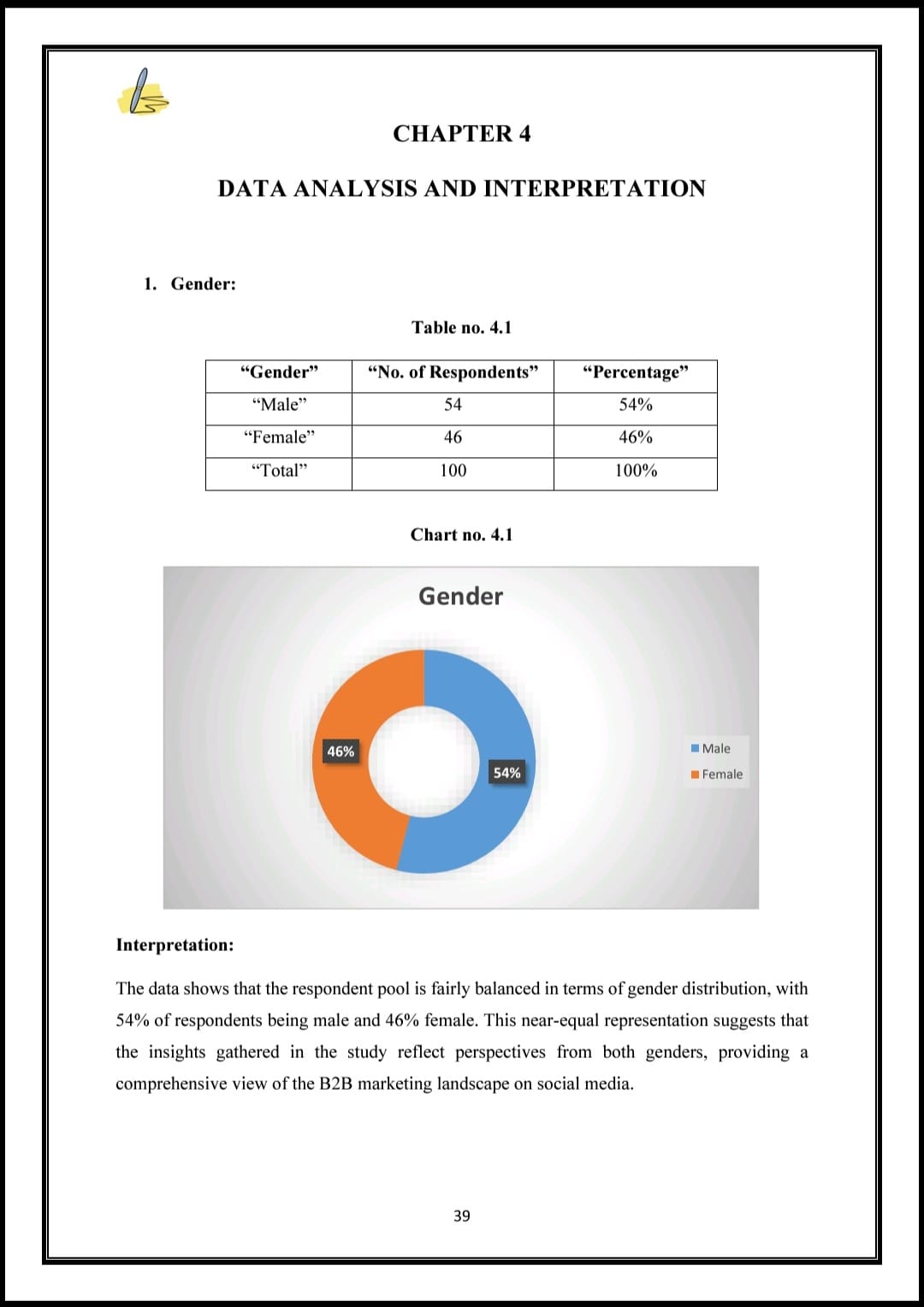 Data Analysis and Interpretation: This is the most important part of any Project Report. In this section, all the accumulated data is properly analyzed and presented neatly with tables, charts and interpretation is written with each question separately.
