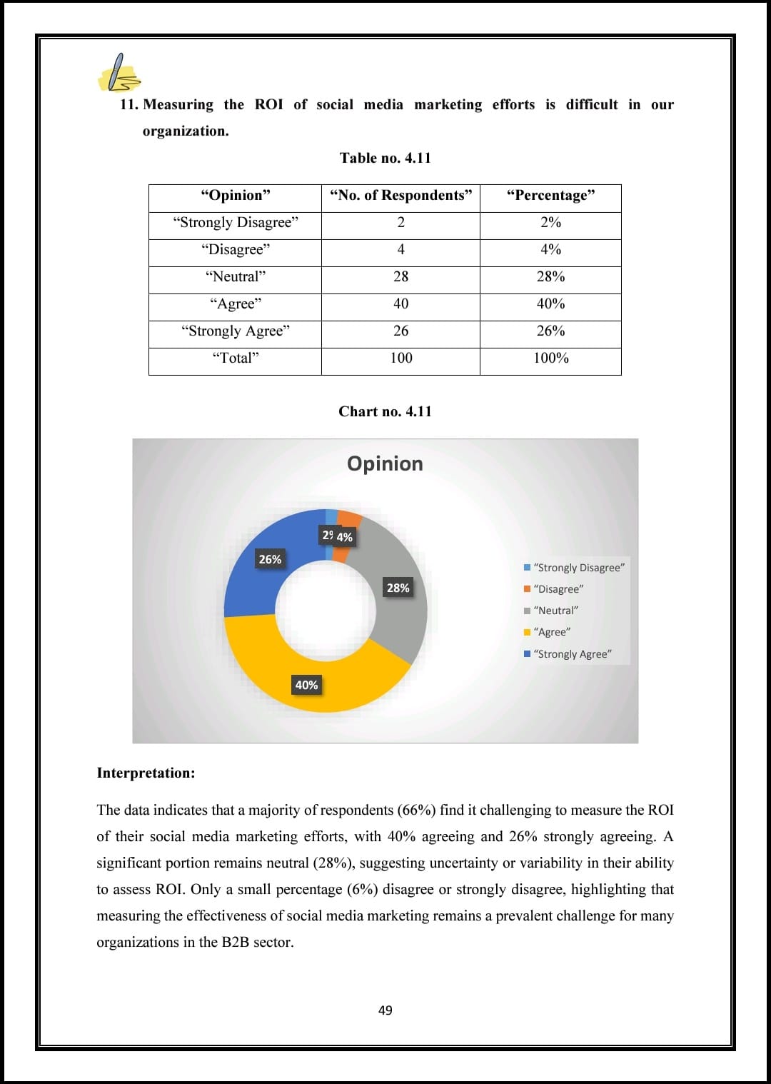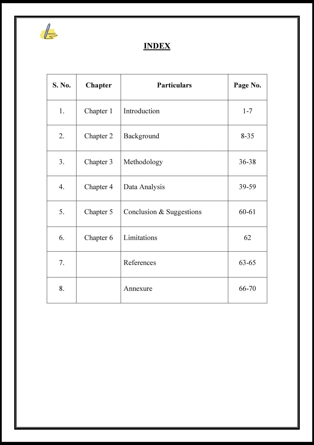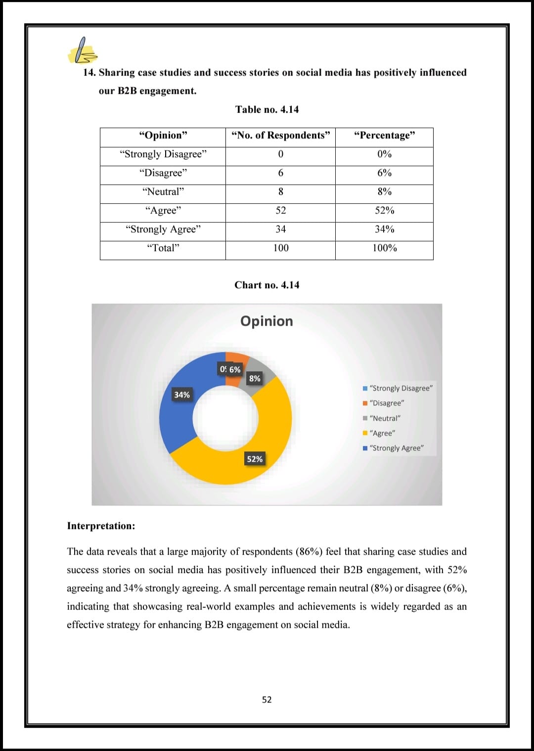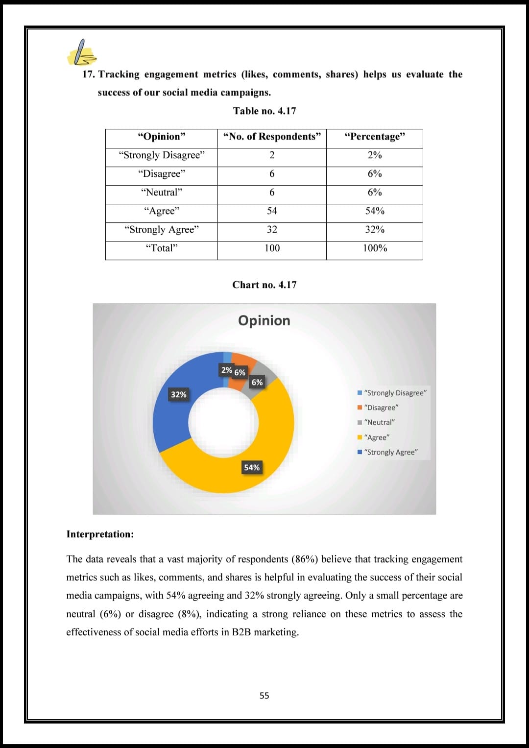 Data Analysis and Interpretation: This is the most important part of any Project Report. In this section, all the accumulated data is properly analyzed and presented neatly with tables, charts and interpretation is written with each question separately.